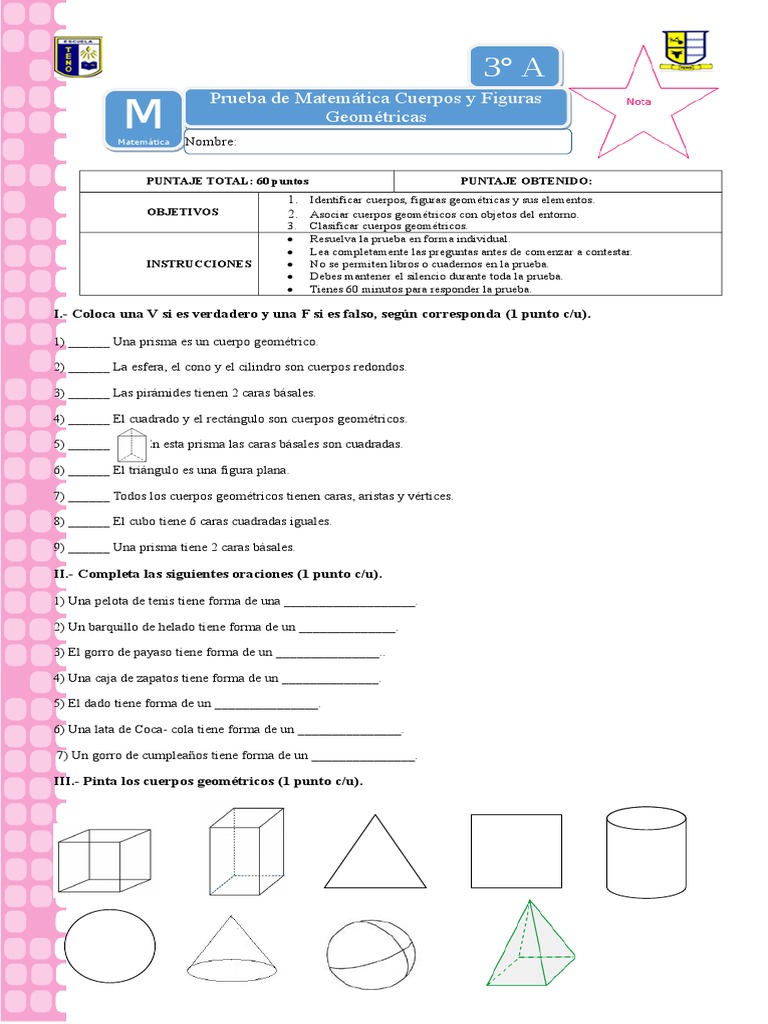 Prueba Matematica Cuerpos Y Figuras Geometricas 3d Y 2d